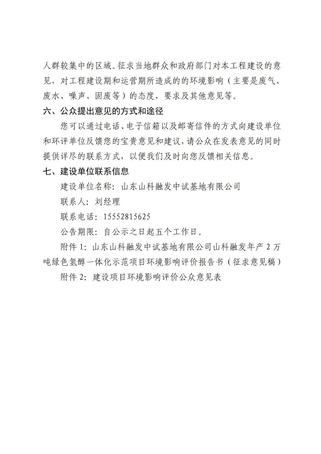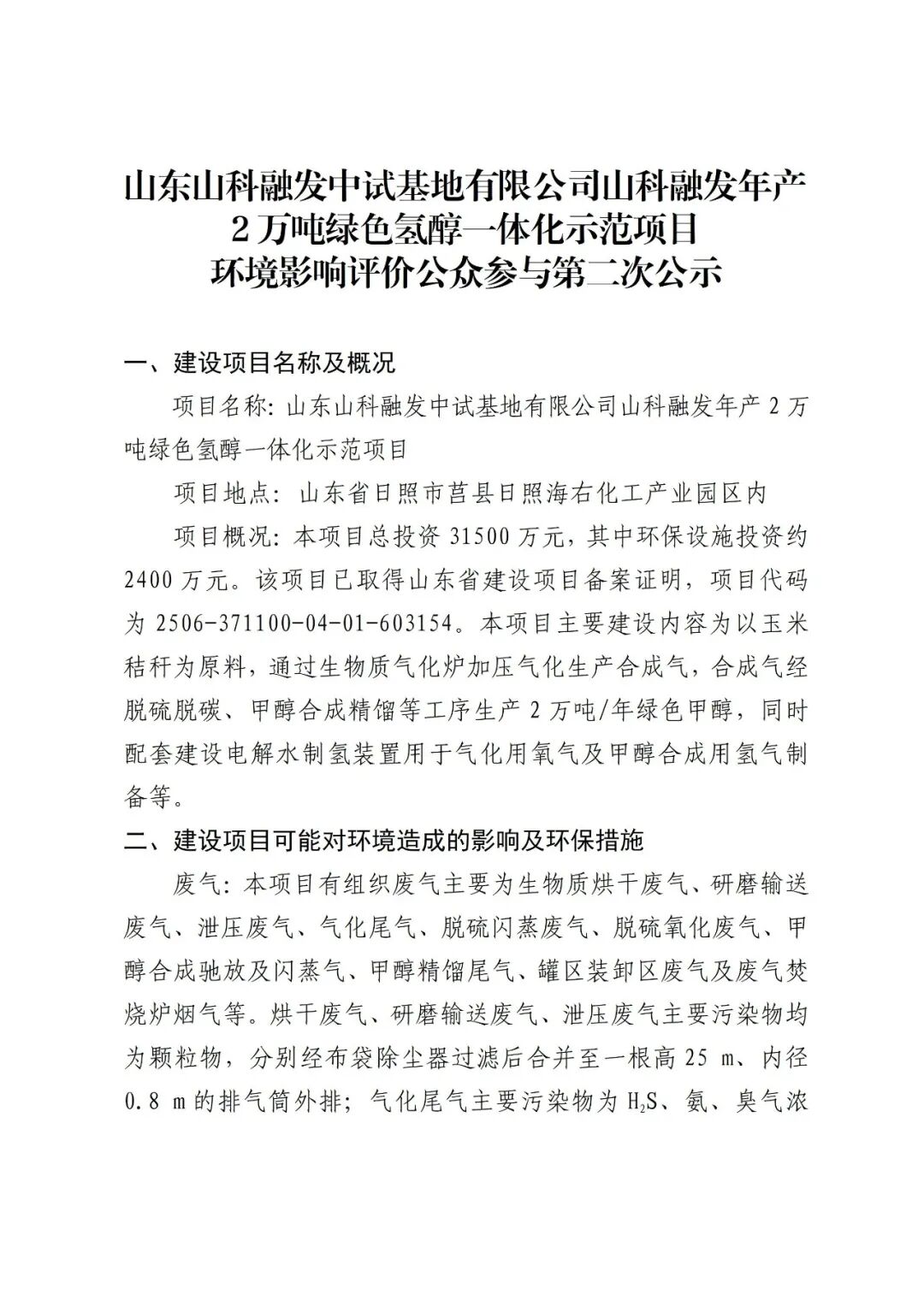 近日,莒縣人民政府發布山東山科融發中試基地有限公司山科融發年產2萬噸綠色氫醇一體化示范項目環境影響評價公眾參與第二次公示。