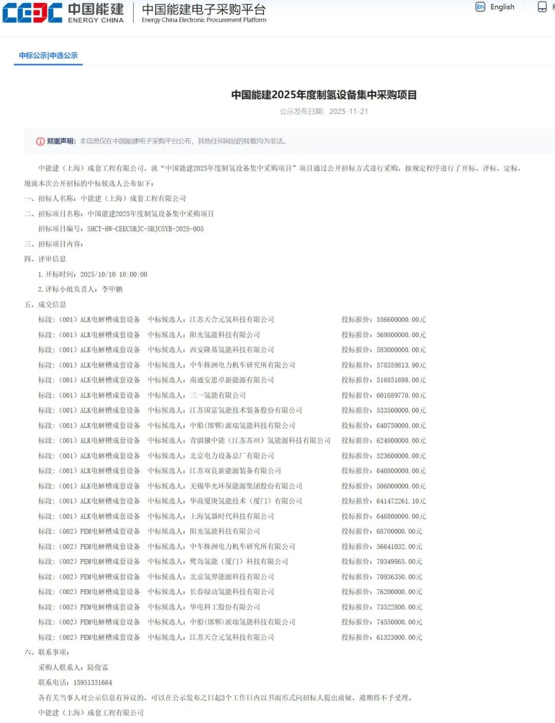 11月21日,中國能建2025年度制氫設備集中采購項目中標候選人公布。