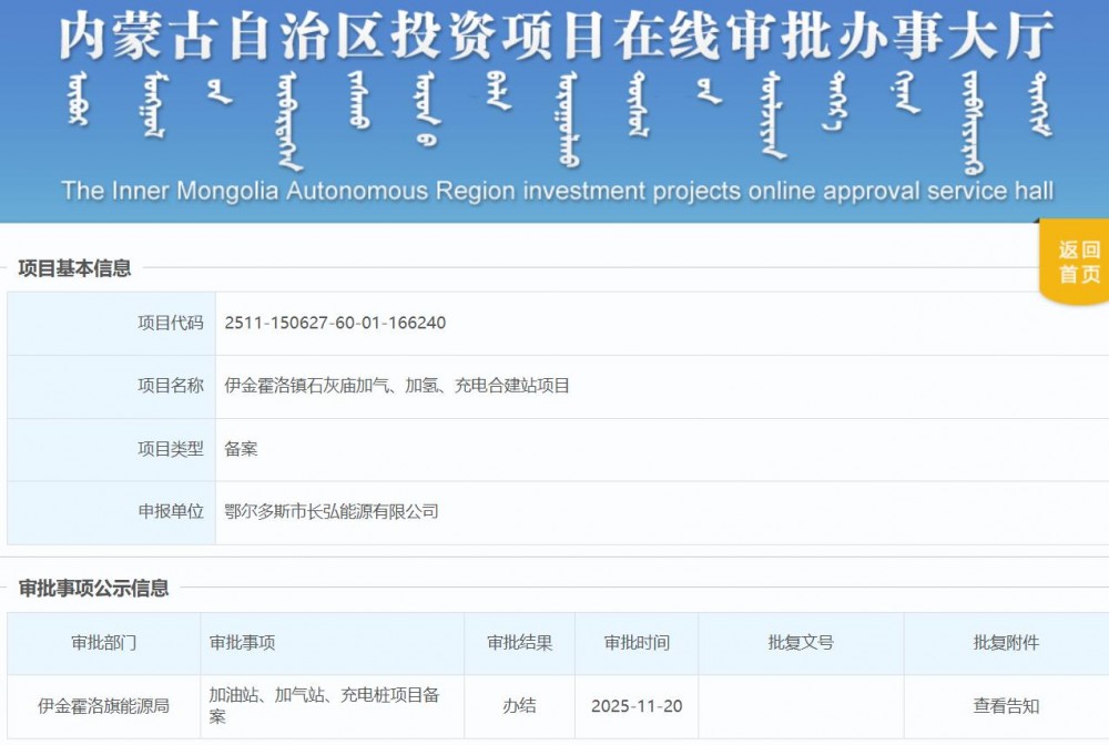 近日,伊金霍洛鎮(zhèn)石灰廟加氣、加氫、充電合建站項目獲備案。