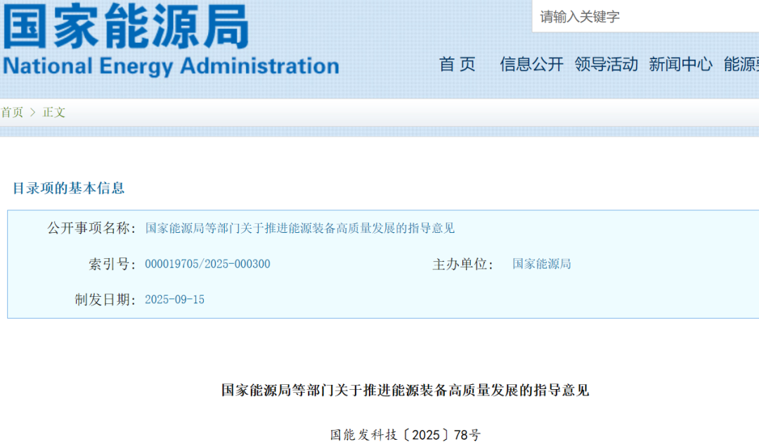 9月22日,國家能源局等部門發布關于推進能源裝備高質量發展的指導意見。