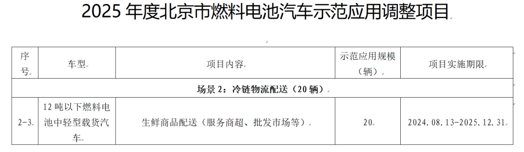 示范應用項目“4-1”為城市客運場景,截至申報截止日,該項目無聯合體申報。按照“規模與期限不變、場景與車型調整”的原則,結合京津冀燃料電池汽車示范城市群示范實際情況,對無申報的項目進行調整,具體如下(調整后的示范項目詳見附件1):將原項目“4-1 10米以上燃料電池客車 企業單位班車通勤及旅游接駁 20輛 2024.08.12-2025.12.31”調整為“2-3 12噸以下燃料電池汽車中輕型載貨汽車 生鮮商品配送(服務商超、批發市場等) 20輛 2024.08.12-2025.12.31”。