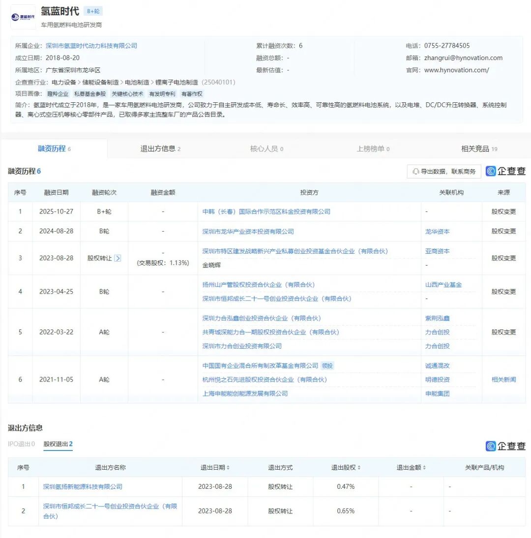 10月27日,深圳市氫藍時代動力科技有限公司(以下簡稱:氫藍時代)完成B+輪融資,本輪融資由中韓(長春)國際合作示范區科金投資有限公司(以下簡稱:中韓科金投資)投資,本輪融資完成后,中韓科金投資公司將持有氫藍時代0.9434%的股份。