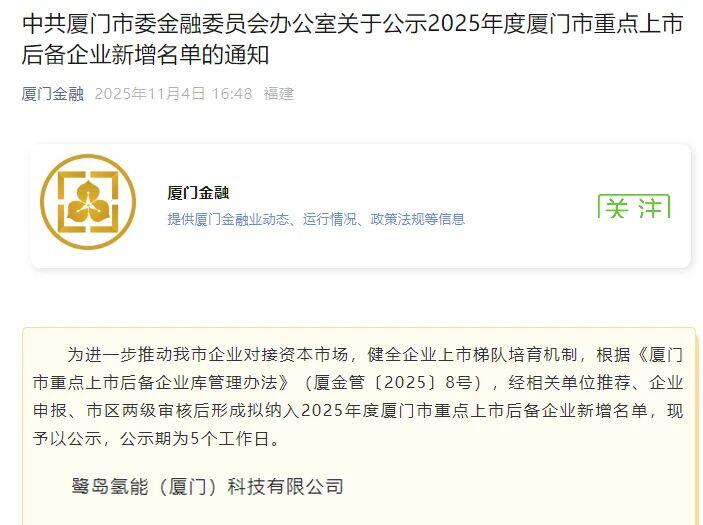 近日,中共廈門市委金融委員會辦公室正式公示 2025 年度廈門市重點上市后備企業新增名單,鷺島氫能(廈門)科技有限公司成功入選,標志著企業在氫能領域的技術實力與發展潛力獲得官方權威認可。